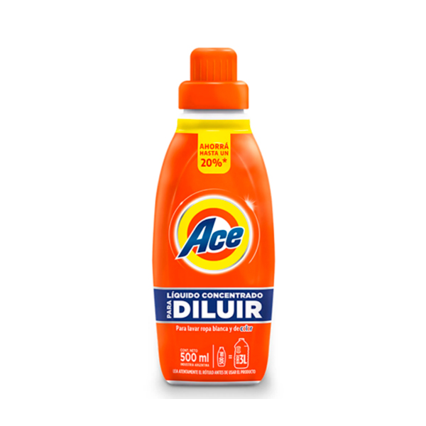 Ace Líquido para Diluir 500 ml Botella es un detergente para el lavado de ropa formulado para diluir antes de su uso. Ofrece una limpieza eficaz, ayudando a remover la suciedad y las manchas habituales, mientras cuida las fibras. Su formato en botella permite una dosificación práctica y controlada. Ideal para lavado a mano y en lavarropas.