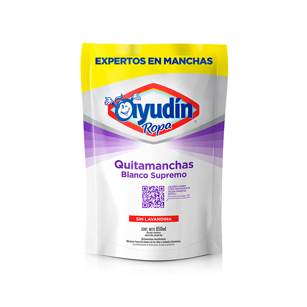 Lavandina Ayudín Quitamanchas Blanco Supremo 650 ml Doy Pack es un producto especialmente formulado para potenciar el lavado y devolver el blanco intenso a las prendas. Su fórmula ayuda a eliminar manchas difíciles y a mantener la ropa blanca más luminosa, cuidando las telas cuando se usa según indicaciones. Es ideal para complementar el lavado en el hogar y lograr mejores resultados en cada uso. La presentación doypack ofrece una recarga práctica y económica.