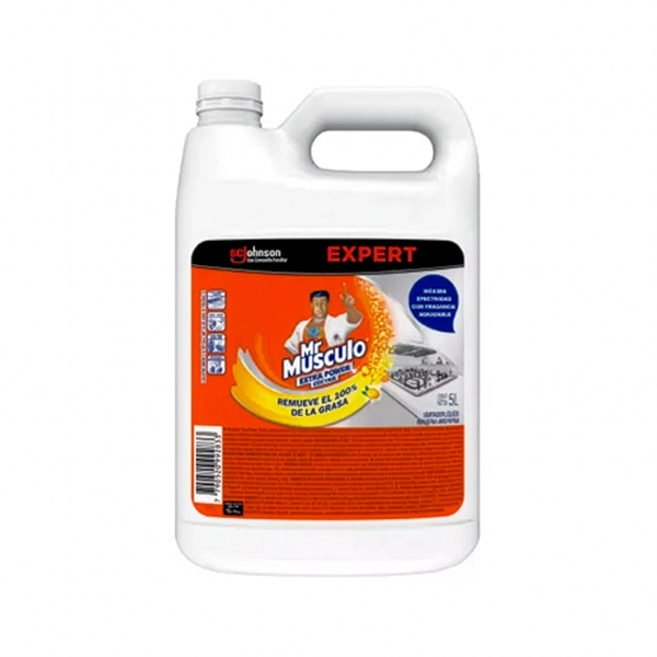 Mr. Músculo Cocina Extra Power 5 L Desengrasante profesional de la marca Mr. Músculo, formulado para la limpieza profunda de superficies de cocina. Elimina grasa pesada y suciedad adherida en mesadas, anafes, campanas y paredes. Presentación de 5 litros, ideal para uso intensivo o institucional.