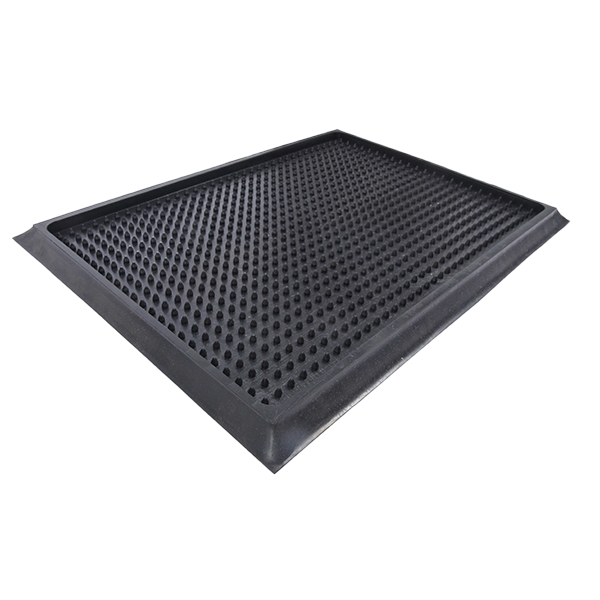 Tapete rectangular para sanitizar y desinfectar la base del calzado. De caucho EPDM de alta resistencia. Fabricada en una sola pieza que evita el derrame de liquidos por roturas o bordes despegados. Bordes biselados de seguridad antitropiezos. Antiderrapante. Apto para usar con hipoclorito de sodio, amonio cuaternario, alcohol y otros solventes. Ideal uso interno y externo en centros de salud, industria alimenticia, centros comerciales, restaurantes, instituciones educativas, hoteleria, industria quimica y farmaceutica y cualquier industria en el cual se requiera sanitizar y desinfectar el calzado al ingresar.